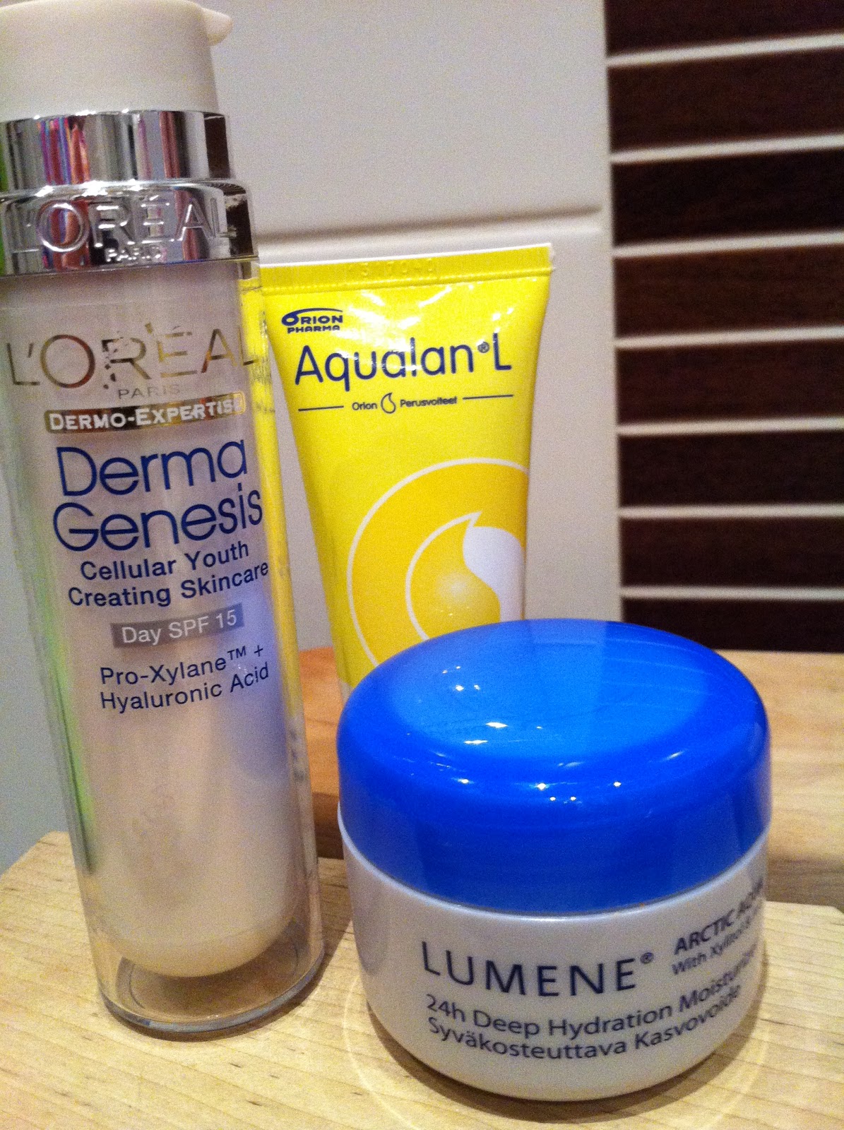 Aamulla kasvopesun jälkeen levitän ihan tavallista kosteuttavaa perusvoidetta, tällä kertaa Aqualan-L, kevyesti kaikkialle kasvoihin. Hetki ennen meikkausta lisään Lumenen syväkosteuttavaa lähinnä silmien alle, luomille, nenään ja poskille. Lorealin kiineyttävää ja silottavaa päivävoidetta levitän silmänurkkiin, otsaan, huultenympärille ja kaulaan.
