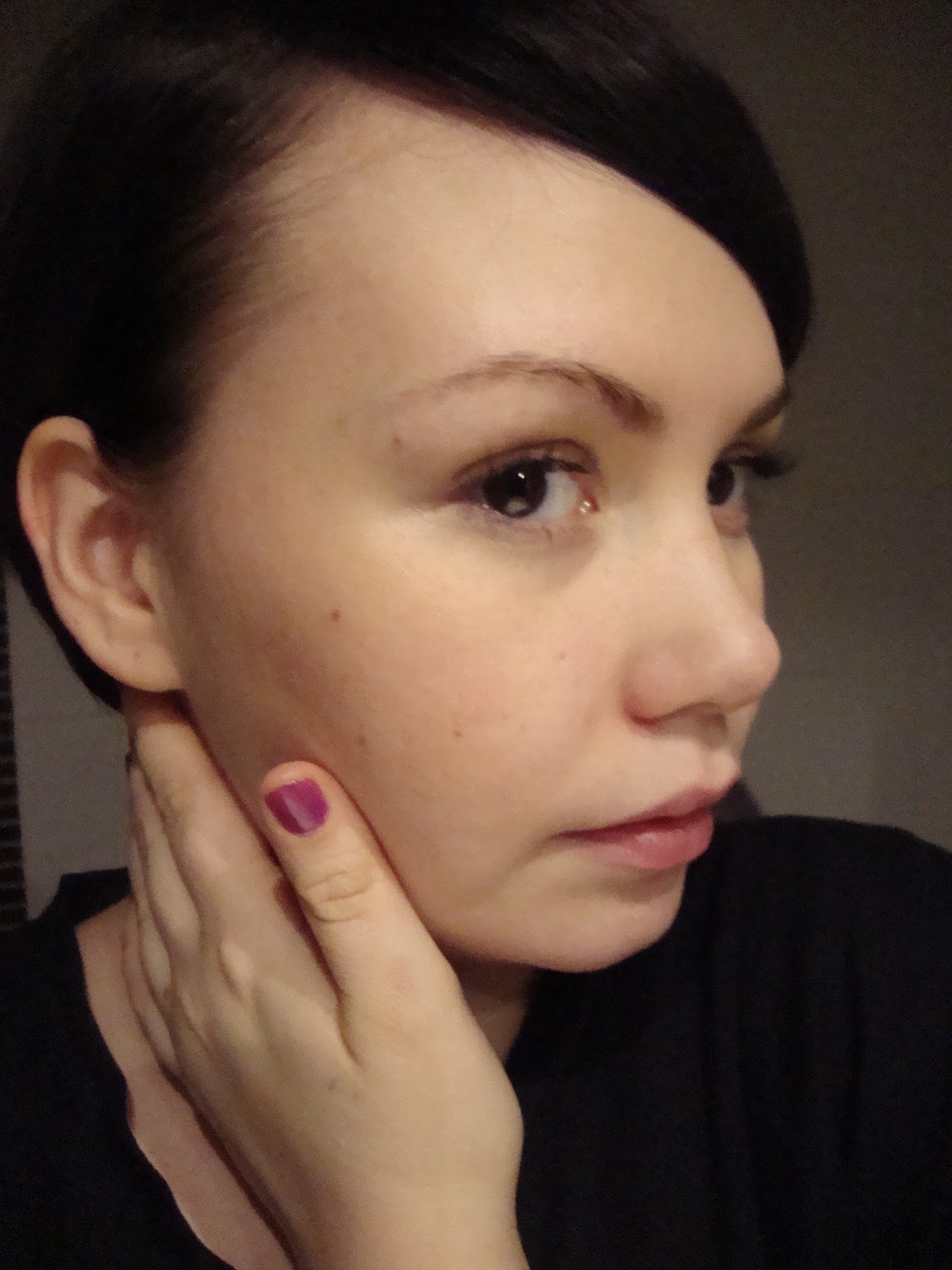 Illaksi sain kuitenkin meikin tehtyä näin: Levitin Rimmellin peitepuikkoa ongelmakohtiin (silmien alle, nenään ja nenänvierustaan poskille), pohjustin myös silmäluomet peitepuikon avulla. Kiinnitin pohjan muut