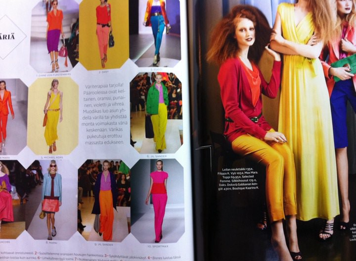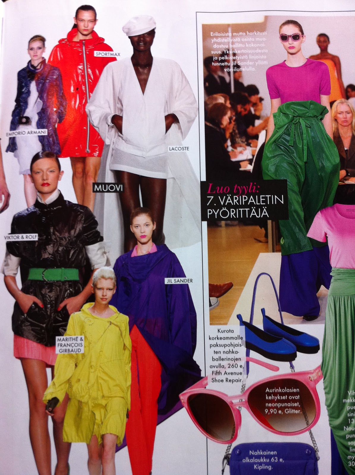 Itse en todellakaan noudata viimeisimpiä trendejä ja pukeudu niiden mukaan, mutta muotilehtiä on kiva lukea ja hakea inspiraatiota omaan tyyliin. Ja nämä värit kyllä piristävät päivää!