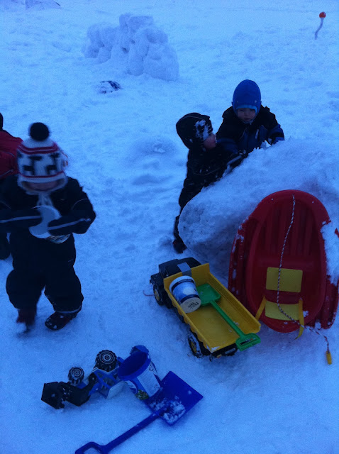 Iltapäivällä lähdettiin pulkan kanssa ulkoilemaan lähipuistoon. Siellä olikin paljon tuttua porukkaa. Ja koska kaikki hiekkalaatikon lelut ovat hautautuneet lumen alle, tuotiin me kotoa jugurttipurkkeja ämpäreiksi, uusi lapio ja rekka-auto. Muutkin olivat tuoneet leluja. Kaapo sai puistossa kauheat raivarit, sillä lumessa kulkeminen on vaivalloista ja vaatii paljon energiaa. Lisäksi toppavaatteiden ja hanskojen kanssa muutenkin vaikea liikkua, nousta ja tarttua leluihin. Eikä samaan aikaan puhkeavat kulmahampaatkaan tunnu kivalta.
