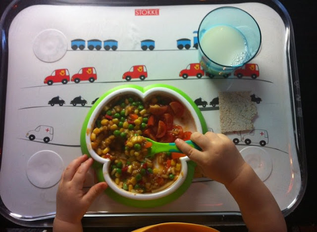 Yritin keksiä keinoa miten poika saisi syödä itsenäisesti, mutta ilman että koko keittiö ja sitä ympäröivä alue sotkeentuisi joka kerta aivan totaalisesti. Meillä oli mm. erilaisia imukupillisia lautasia, mutta ne sai irti alle aikayksikön. Harjoittelimme samaan aikaan mukista juomista, joten kaaos oli taattu. Kun ruoan lisäksi astiat kiinnostivat, ei ruoka pysynyt kauaa lautasella. En kuitenkaan tahtonut siirtä ruokailutilanteita kylppäriin, kuten olen kuullut joidenkin tekevän.