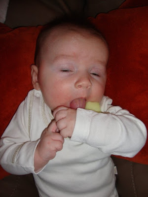 Jo ennen 5 kuukautis päivää oltiin kokeiltu jo sormiruokailuakin. Se tietysti oli aluksi pelkän maun saamista suuhun. Kokeiltiin mm omenaa, päärynää ja kurkkua. Ensimmäiset hampaatkin tulivat vasta yhdeksän kuisena, joten se oli pitkään pelkkää imemistä, mutta silti mieluisaa puuhaa.