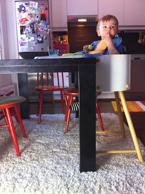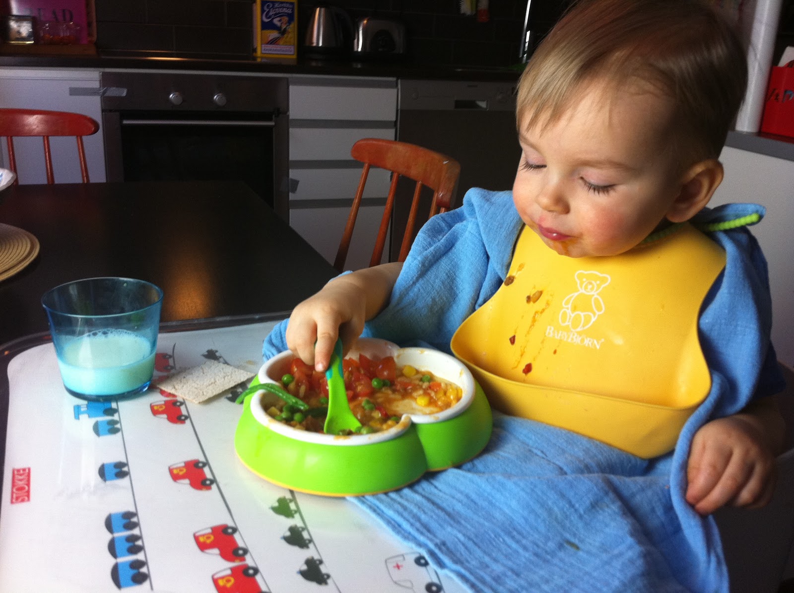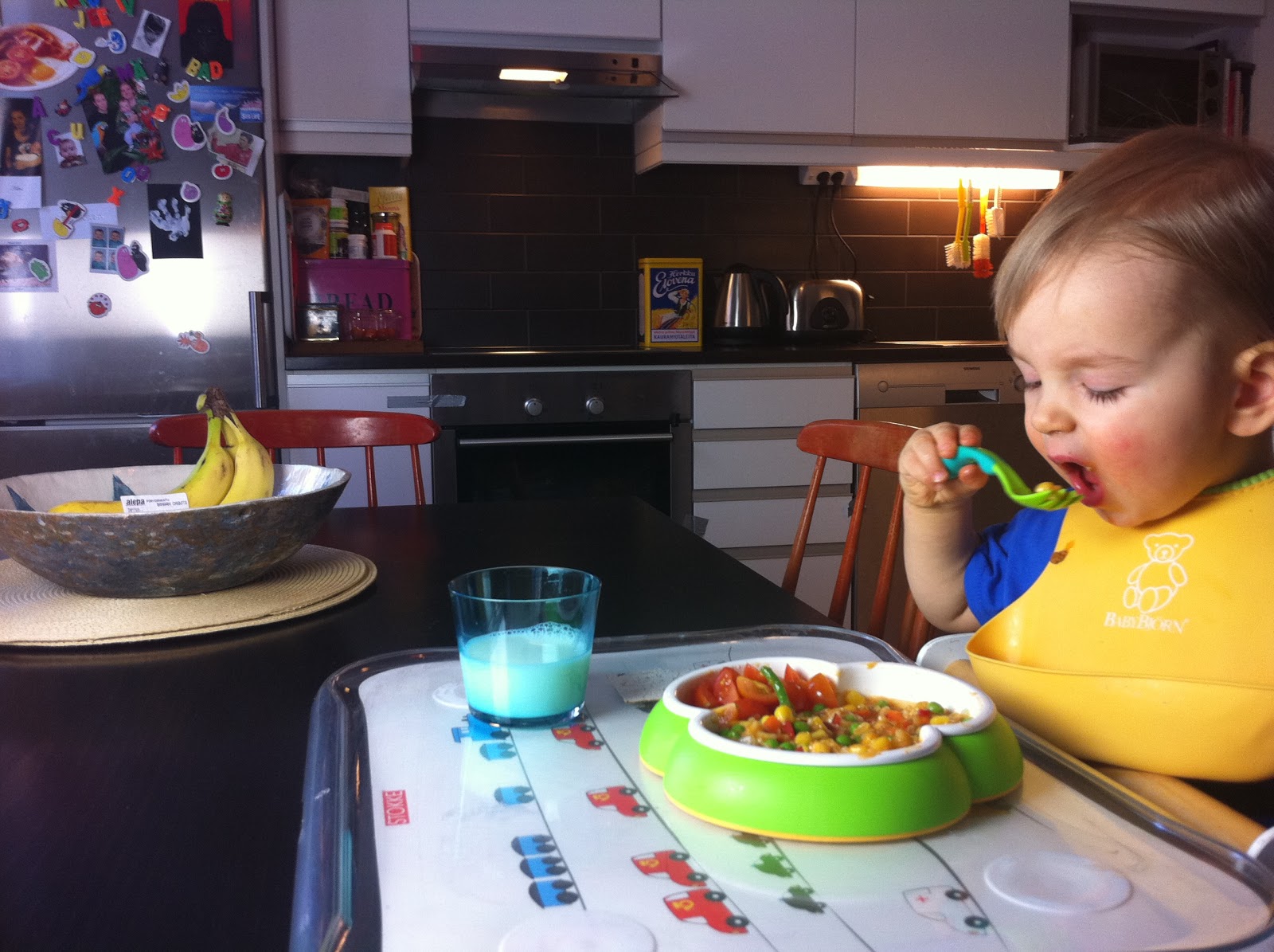 Yritin keksiä keinoa miten poika saisi syödä itsenäisesti, mutta ilman että koko keittiö ja sitä ympäröivä alue sotkeentuisi joka kerta aivan totaalisesti. Meillä oli mm. erilaisia imukupillisia lautasia, mutta ne sai irti alle aikayksikön. Harjoittelimme samaan aikaan mukista juomista, joten kaaos oli taattu. Kun ruoan lisäksi astiat kiinnostivat, ei ruoka pysynyt kauaa lautasella. En kuitenkaan tahtonut siirtä ruokailutilanteita kylppäriin, kuten olen kuullut joidenkin tekevän.