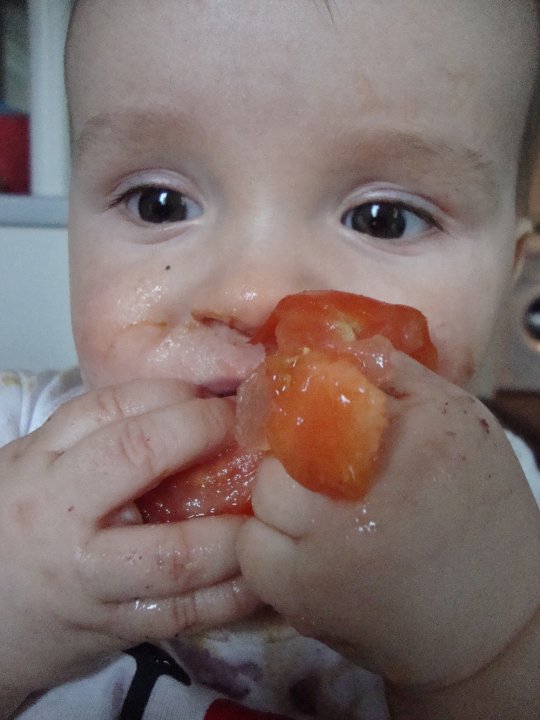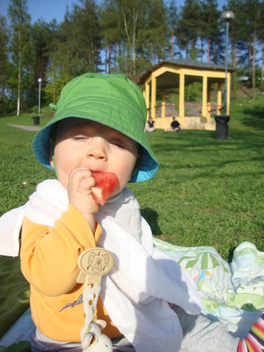 Kaapon ruoassa panostetaan hyvään laatuun, terveellisyyteen ja luomuun (vaikka yllä olevasta kuvasta ei ehkä uskoisi). Kaapo herkuttelee erilaisilla hedelmillä ja vihanneksilla. Välillä turvaudumme kuitenkin purkkiruokaan, aikuisten herkkuja Kaapo ei ole saanut kuin muutaman maistiaisen (keksiä, jäätelöä..). Mutta ruokajutut sikseen, nyt puhutaan SYÖMISESTÄ ;D