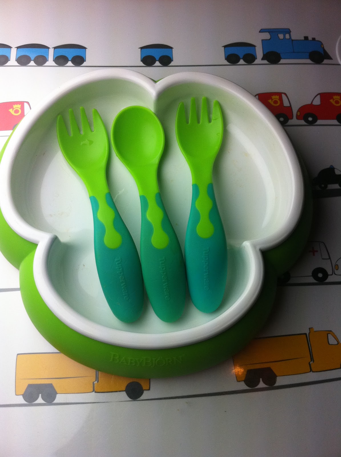 BabyBjörnin lautanen on mukavan painava, pohjassa on kumia joka estää lisää lautasen liikkumista pöydällä eikä se voi kipata. Kolmiapilan muotoiseen lautaseen saa hauskasti eroteltua halutessa eri ruoka-aineet.