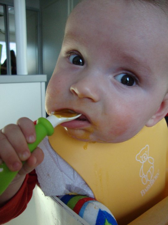 Puolen vuoden iässä olikin jo syntynyt mukava, säännöllinen ruokailurytmi, 5 kertaa päivässä. Sen jälkeen alettiin myös vähentämään asteittain maitoa ja lisäämällä annoskokoja. Innostuttiin myös yhä enemmän sormiruokailusta.
