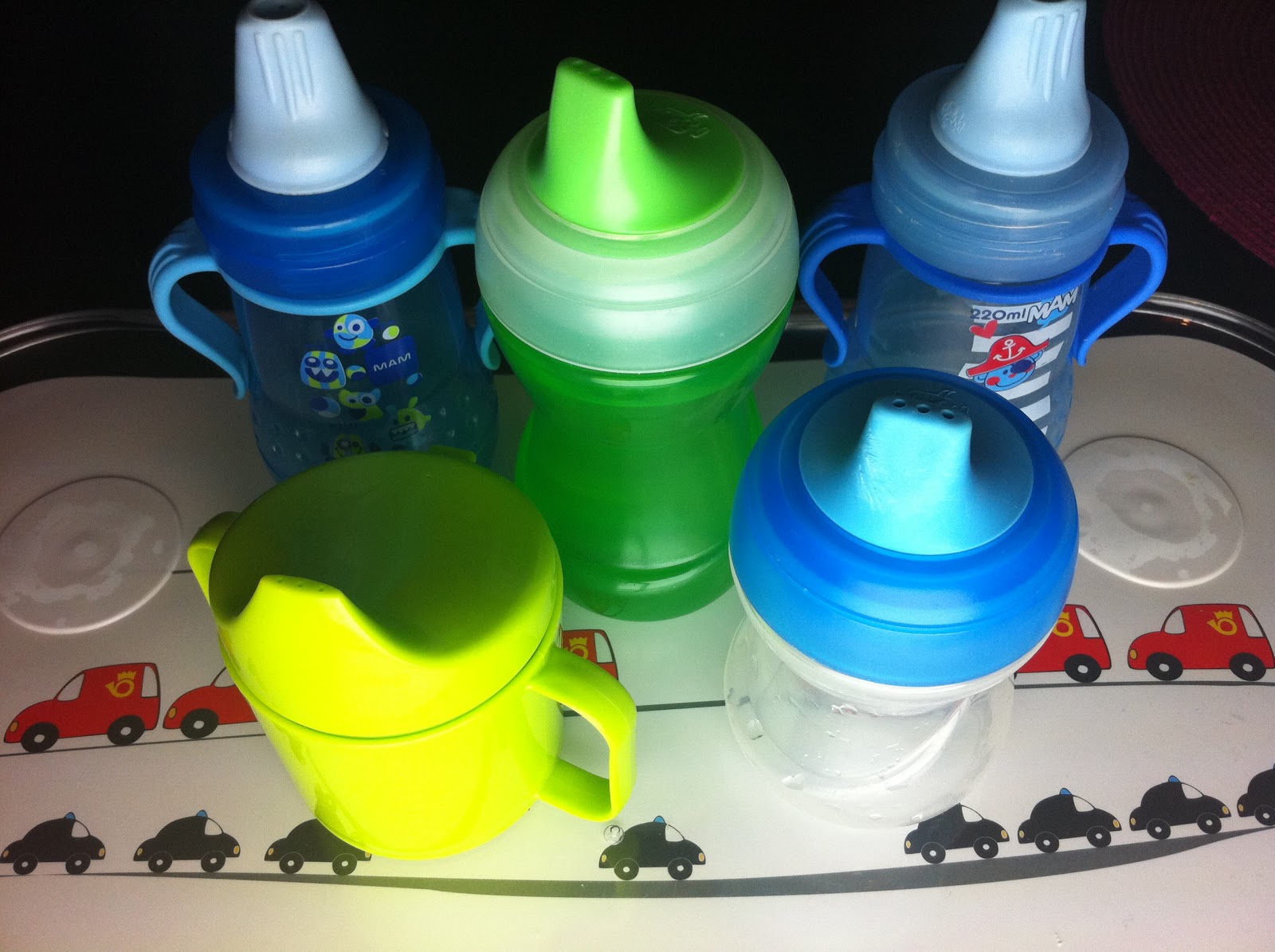 Näitä meillä käytettiin juomiseen. Takana olevat kaksi silikoninokallista nokkamukia ovat hyviä silloin, kun tuttipullosta aletaan siirtymään nokkamukiin. Ne eivät kuitenkaan ole pidemmän päälle hyviä, sillä ne vahingoittavat purentaa yhtälailla kuin tavallisesta tuttipulosta juominen. Tuttiosasta pitää purra juodessa, muuten niistä ei tule mitään. Suosittelen näitä 6 kk eteenpäin korkeintaan vuoden ikään saakka.