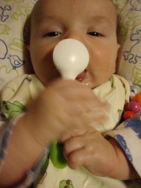 Jo ennen 5 kuukautis päivää oltiin kokeiltu jo sormiruokailuakin. Se tietysti oli aluksi pelkän maun saamista suuhun. Kokeiltiin mm omenaa, päärynää ja kurkkua. Ensimmäiset hampaatkin tulivat vasta yhdeksän kuisena, joten se oli pitkään pelkkää imemistä, mutta silti mieluisaa puuhaa.