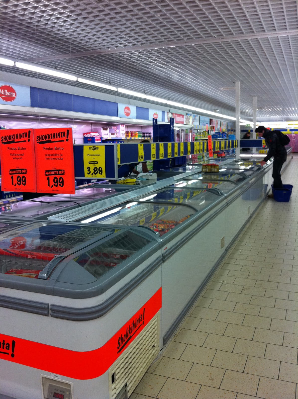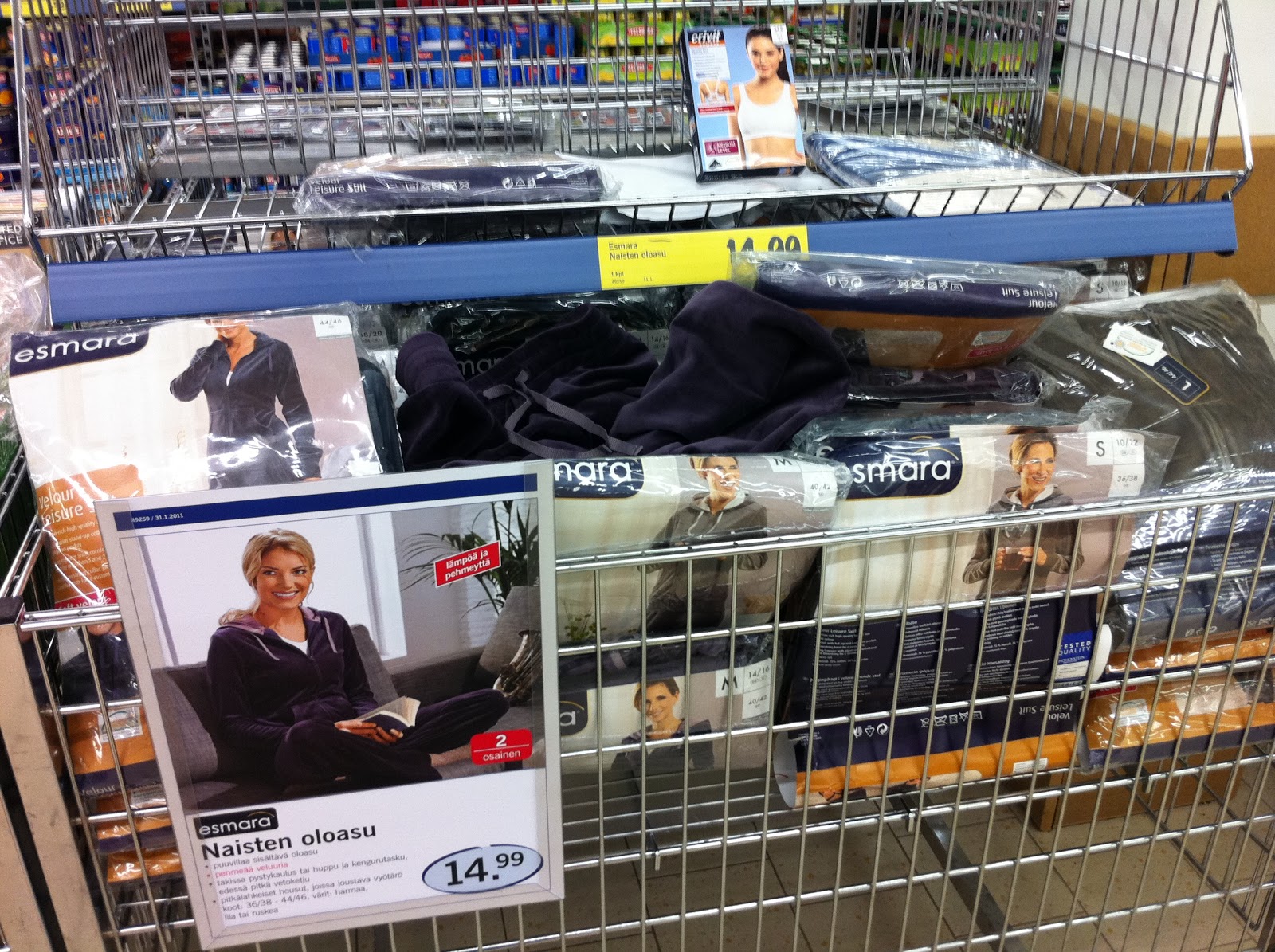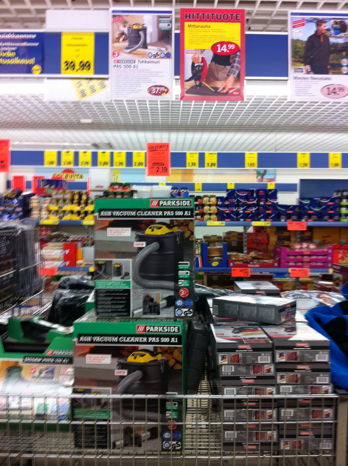 Tälläkin kertaa ihmettelin erilaisia hilloja, marmeladeja, pähkinöitä, säilykkeitä, ihan uudenlaisia mikroeineksä ja makkaroita ja erilaisia pakasteita. Suurta huvitusta aiheutti myös käytävä jossa myytiin mitä merkillisempää tavaraa. Ranne -ja polvitukia, työkaluja, vaatteita, imureita, skumppa coolereita, takan kipinäsuojia, kitaran vieittimiä… Osa ruokatuotteista oli tosi edullisia, jopa puolet esim alepan hinnoista. Pitäis käydä useammin, mutta sitten se ei tuskin olis enään niin hauskaa.