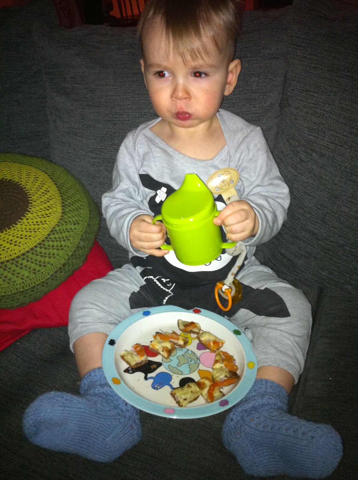 Laita molemmille villasukat jalkaan. Tee voikkareita ja kaakaota. Katso telkkarista Mentalistia samalla kun lapsesi katsoo Dinojunaa iPhonelta. Kun voikkarit ovat valmiit syö ja katso Grayn Anatomiaa nauhalta lapsesi kanssa. Viisi minuttia ennen kuin lapsesi nukahtaa (klo 02), siirry sohvalle kiukkuisena nukkumaan. Nuku siinä aamun saakka huonossa asennossa, kunnes lapsesi taas herää (klo 8).