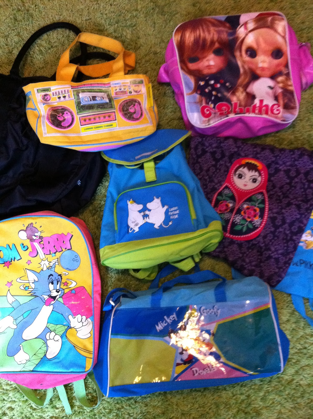 Mitään virralista hoitolaukkua en ole ikinä hankkinut. Kivoimmat laukut ovat turhan hintavia enkä myöskään tajunnut ajatusta että itse laukku vie enemmän tilaa kuin sen sisältö. Meillä onkin hoitolaukun virkaa toimittanut mm tavallinen kangaskassi, kirjakerhon reppu ja jumppakassi. Lempparit ovat ehdottomasti Teneriffalta ostettu kasarihenkinen Disneyn putkikassi sekä kirpparilöytö Tom & Jerry reppu. Kassit ja pussukat saa myös paremmin tungettua tavaratilaan. Tällä kertaa tavarat menivät hyvin maatuskakassiin ja tilaakin jäi paljon.