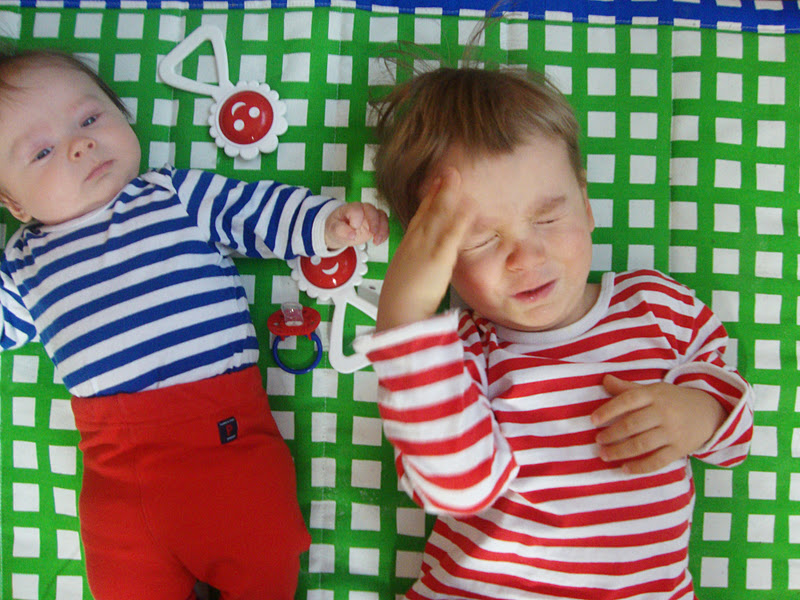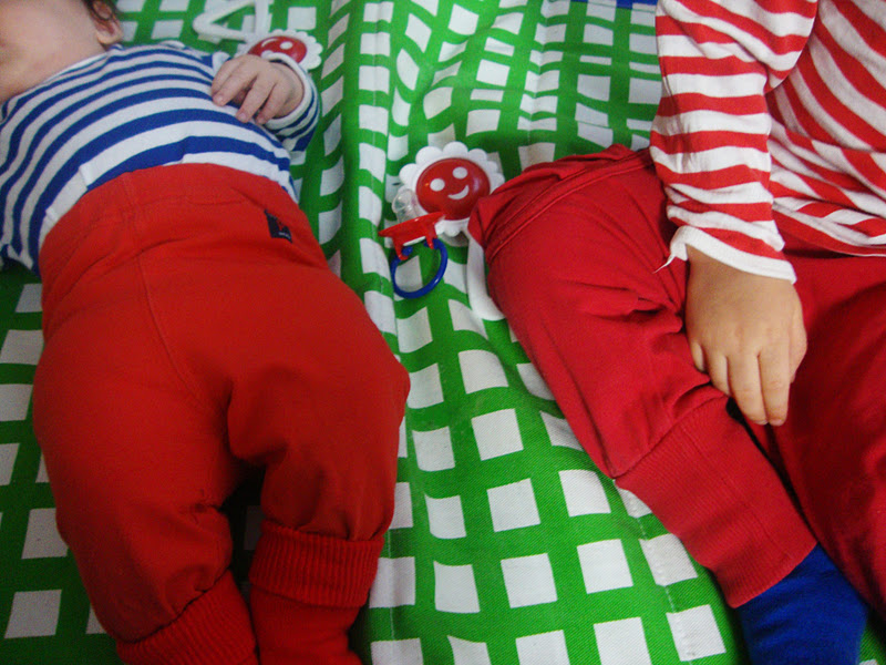 Ja vihreää ja sinistä, ruutua ja raitaa. Ikkunasta ihmetellään lumituiskua ja köllötellään leikkimatolla.