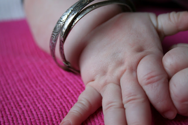Noita suloisia, pulleroisia vauvakäsiä voisi kuvata vaikka kuinka! Elvis ei koruista pahemmin välittänyt mutta Kaapo leikkii niillä parhaillaan. Ovat kuulemma ihania. Pitäisi vielä putsata korut. Miten sitä hopeaa kiilotettiinkaan kotikonstein? Hammastahnalla? Sen jälkeen laitan ne jonnekkin talteen. Ovat mielestäni vähän liian tyttömäisiä meidän pojille käytettäviksi. Omaan käteenkään niitä en saa enään ängettyä.