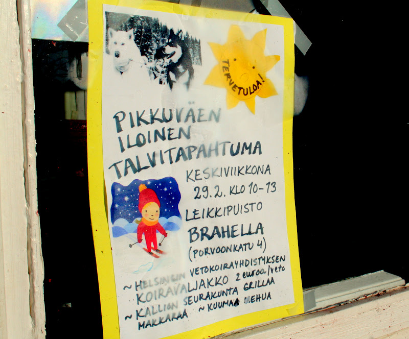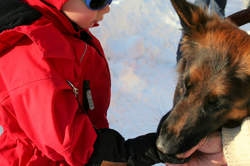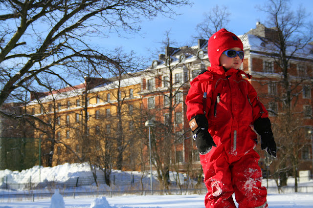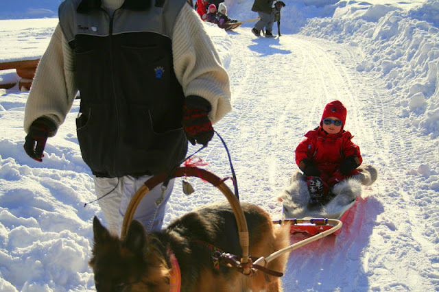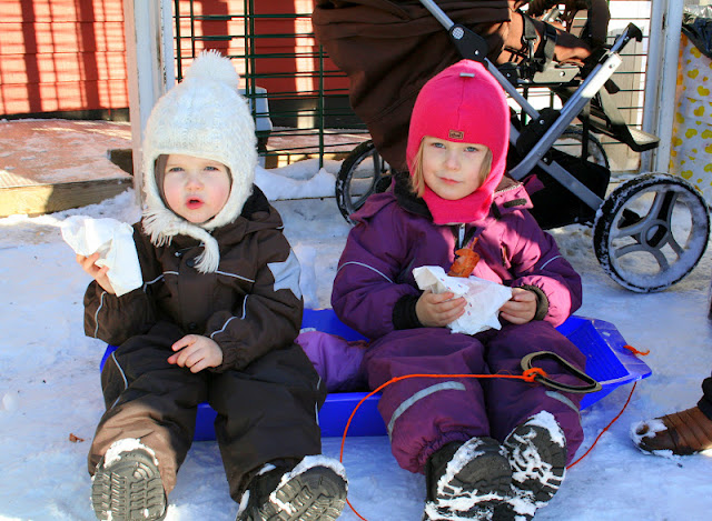 Aurinkoinen talvipäivä, kavereita, lumileikkejä, mäenlaskua, koiravaljakko, makkaraa, vohveleita ja kuumaa mehua. Kotona punaposkisia poikia, päiväunet, lehtiä ja terveellistä kuumaa kaakaota (eli ilman kermavaahtoa). Niistä oli eilinen päivä tehty.