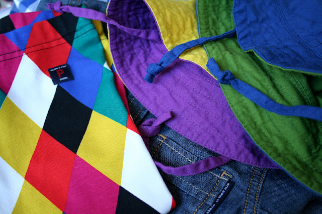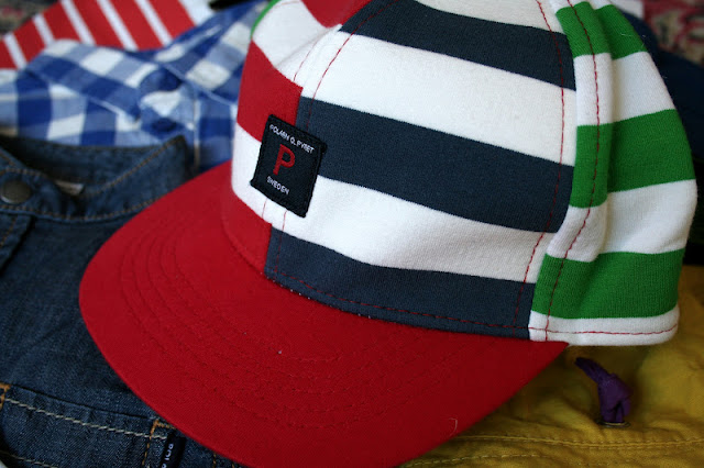 Haalarin lisäksi kassista löytyi Elvikselle muutama kesähattu ja farkkupaita. Kaapolle ruudullinen kauluspaita, värikkäät salmiakkikuviolliset legginssit ja siniset chinot. POPin liikkeestä kävin vielä ostamassa multiraidallisen lippiksen. Äh.