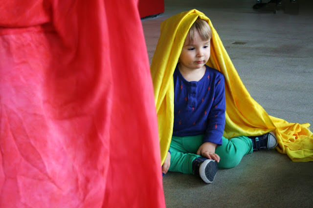 Näyttelyssä tutustuimme muutamaan teokseen. Yhden maalauksen ääreen kokoonnuimme istumaan ja meitä sadutettiin. Lapset siis kertoivat tarinan, mitä heidän mielestään taulun kuvassa tapahtui ja se kirjoitettiin ylös. Jokainen lapsi sai myös taikakiikarin, eli pienen teleidoskoopin jonka läpi teoksia oli jännä katsoa. Samalla kun oppaat viihdyttivät lapsia silkkihuiveilla saimme me aikuiset tutustua pikaisesti Sophie Callen Take Care of Yourself näyttelyyn.