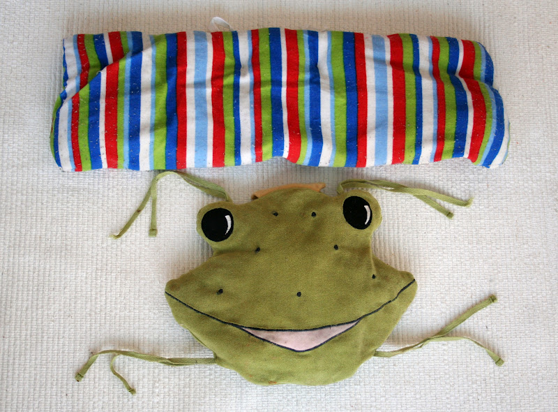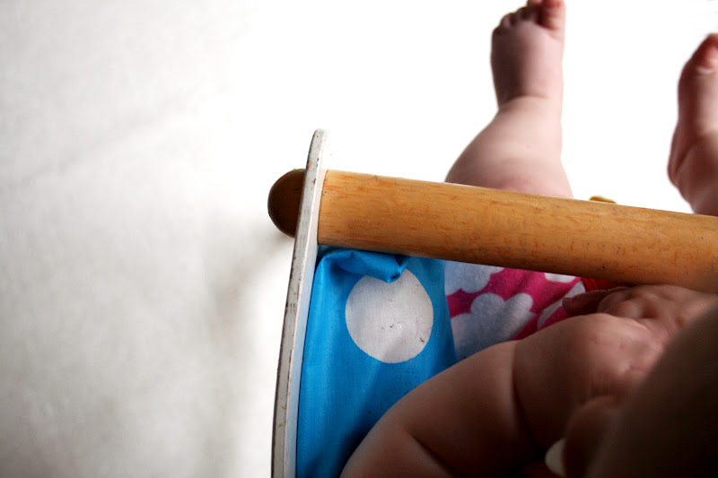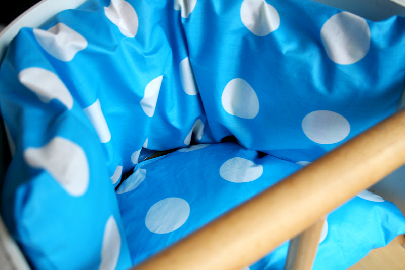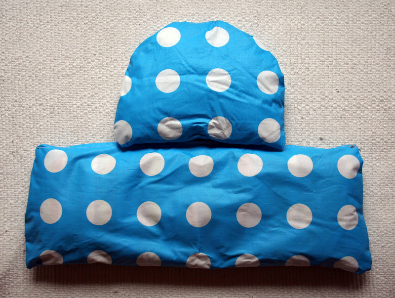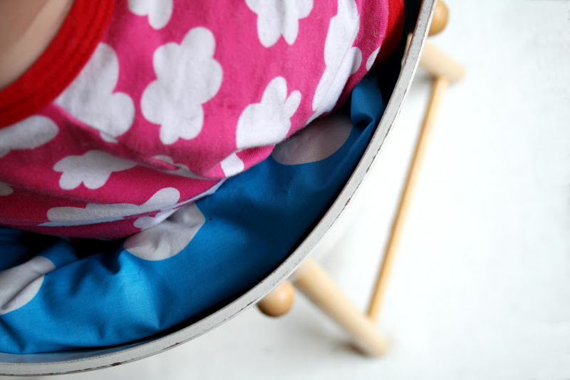 Selkänojan päälle surautin kankaan suoraan, pyllypehmusteesta päädyin käyttämään pelkän sisuksen. Ei todellakaan mikään parhaimmista taidonnäytteistäni, kangaskin oli kauhean ryppyinen vauvan toimesta, mutta toimii just eikä melkeen.