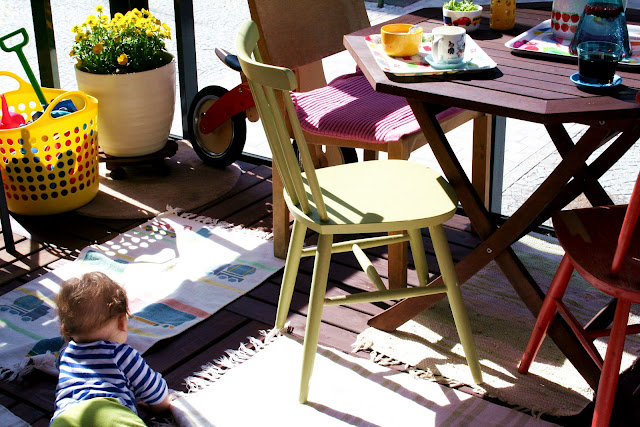Hih kiitos! On se kyllä viihtyisä. Kastumisen varaa tosiaan ei ole, jos vain musitaa sulkea ikkunat… 😉 Joku vanhakankainen pöytäliina kyllä kelpaisi parvekkellekkin. Kankainen likaantuu niin nopeasti, on katupölyä, siitepölyä, ja lapset. Ja eräs huoltomies joka VAHINGOSSA PORASI parvekkeen liinaan reiän viime kesänä! 😀 !