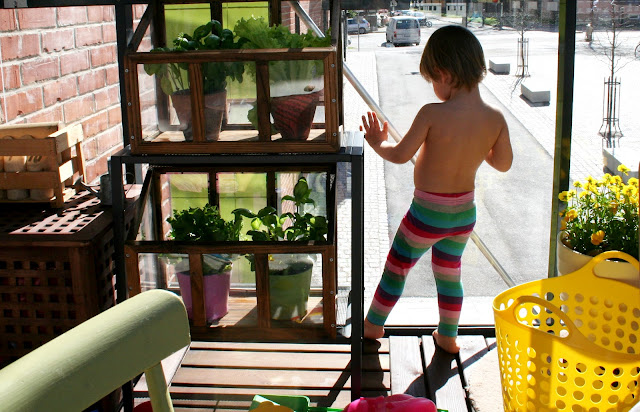 Kesäpartsille kuuluu myös tietysti pikkuinen kasvimaa eikö. Löysin muutama vuosi sitten Anttilan nettikaupasta nuo minikasvihuoneet. Ne on ihanat, niissä voi kasvatella salaatteja ja yrttejä helposti keväästä syksyyn. Kannelliset laatikot ovat puuta ja ikkunat muovipleksiä. Joskus vielä vaihdan ne lasisiksi joilloin niistä tulee vielä ihanemmat.