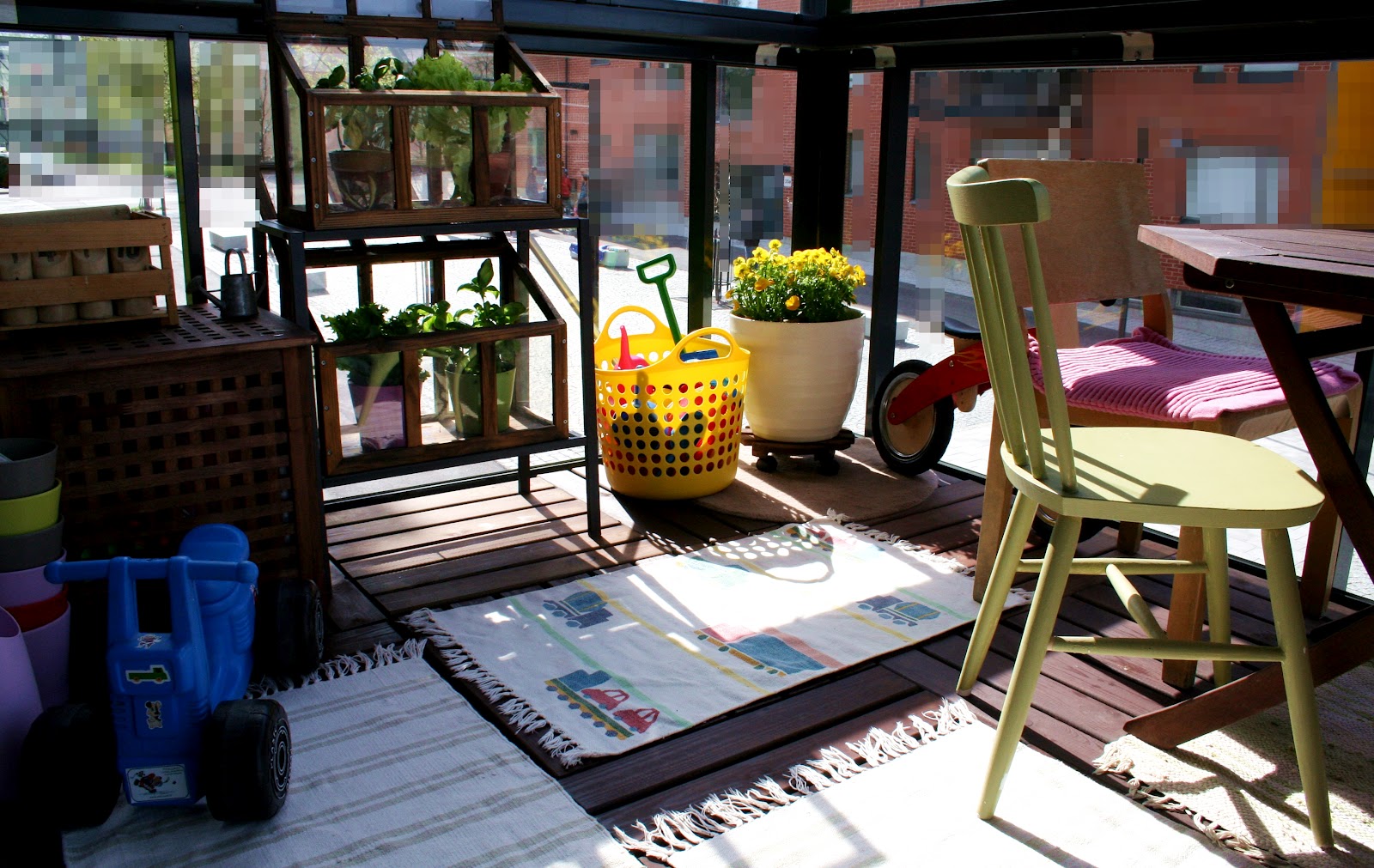 Parveke on lattiasta kattoon lasia. Paljon ollaan mietietty myös jotain verhoja. Olisi mukava saada välillä suojaa suoraan porottavalta auringolta tai mahdollisilta uteliailta naapureilta. Valkoiset rullaverhot olisivat kivoimmat. Mutta kun kahdelle seinälle tarvitsee yhteensä kaksitoista verhoa ja yhdelle vielä kahdeksan, jotka jokainen täytyy porata metalliin, menee homma turhan hankalaksi ja hintavaksi. Olenpa miettinyt jopa aurinkoisemman puolen alalasien maalaamista valkoisella sormivärillä.