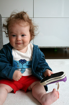 Viime viikolla pikku-Elvari täytti jo kahdeksan kuukautta. ’Virallisiin’ 8kk kuviin toi pientä lisää unisen hassunaaman lisäksi musta silmä. Täytettyyään seitsemän kuukautta Elvis otti muutamassa päivässä hurjan spurtin. Ihan yhtäkkiä se alkoi ryömimään käsittämätöntä vauhtia, seuraavaksi konttasi vieläkin kovempaa, nousi polvilleen ja seuraavaksi seisoskeli jo ihan kunnolla ja kokoajan.