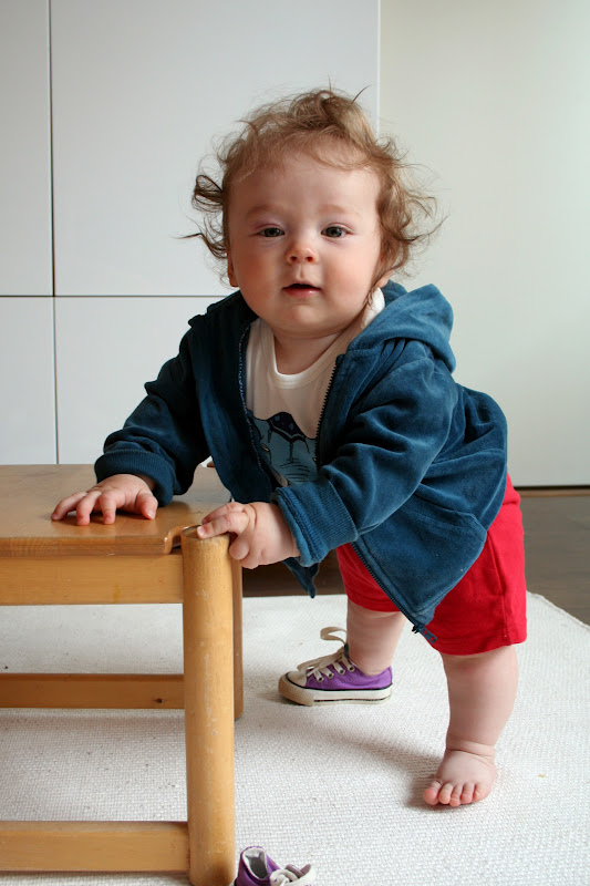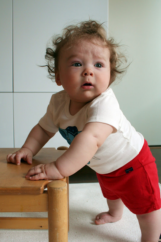 Kun yhtenä iltana Elvari sai kammettua itsensä pinnasängyssä pystyyn on suunta ollut vain ylöspäin. Seistä on pitänyt siitä saakka ihan koko ajan. Onneksi kuitenkin pääosin vain hereillä ollessa, toisin kuin isoveljensä.. Muutaman viikon ajan olimme sydänsyrjällään kun tyyppi nousi kaikkea vasten ja kaatui. Ja kaatui ja kaatui ja kaatui ja kaatui. Sitten se oppi laskeutumaan, huh. Haavereita toki sattuu edelleen mutta vähenevässä määrin.
