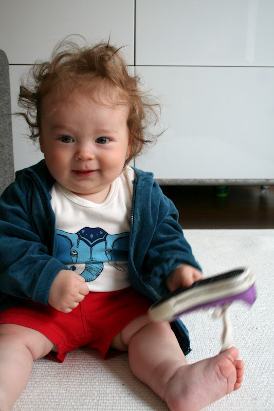 Viime viikolla pikku-Elvari täytti jo kahdeksan kuukautta. ’Virallisiin’ 8kk kuviin toi pientä lisää unisen hassunaaman lisäksi musta silmä. Täytettyyään seitsemän kuukautta Elvis otti muutamassa päivässä hurjan spurtin. Ihan yhtäkkiä se alkoi ryömimään käsittämätöntä vauhtia, seuraavaksi konttasi vieläkin kovempaa, nousi polvilleen ja seuraavaksi seisoskeli jo ihan kunnolla ja kokoajan.