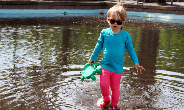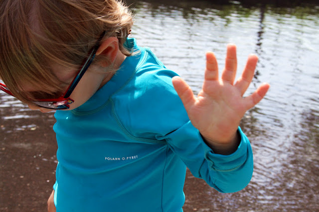 Yhtä uv-suoja lippistä lukuunottamatta lapsemme eivät ole aiemmin omistaneet UV-suojavaatteita. Olen kylläkin ollut aina kovin varovainen auringon kanssa, suojannut herkkää ihoa vaatteilla, varjolla ja paksuilla fysikaalisillatököttisuojavoiteilla. Mutta koska itse nautin auringosta, kesästä ja kuumudesta on lapsienikin pakko, heh. Voin siis hyvin mielin hengailla aamusta iltaan puistoissa ja rannalla lasten kanssa välillä myös suorassa auringonpaisteessa. Voisi kuvitella että pitkähihaisessa ja lahkeellisessa puvussa on myös mukava leikkiä märässä rantahiekassa samoin kun kuumalla hiekalla. Lasta on helpompi käsitellä vedessä puku päällä, jolloin hän ei ole liukas. Materiaali kuivuu myös nopeasti ja ehkä myös lämmittää hieman vedessä.