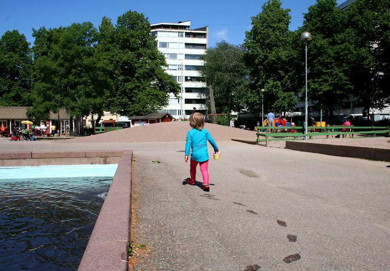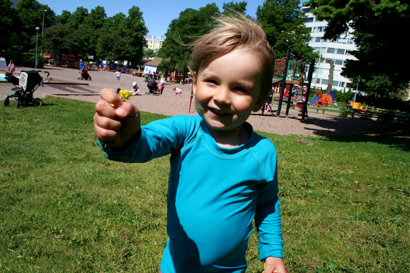 Yhtä uv-suoja lippistä lukuunottamatta lapsemme eivät ole aiemmin omistaneet UV-suojavaatteita. Olen kylläkin ollut aina kovin varovainen auringon kanssa, suojannut herkkää ihoa vaatteilla, varjolla ja paksuilla fysikaalisillatököttisuojavoiteilla. Mutta koska itse nautin auringosta, kesästä ja kuumudesta on lapsienikin pakko, heh. Voin siis hyvin mielin hengailla aamusta iltaan puistoissa ja rannalla lasten kanssa välillä myös suorassa auringonpaisteessa. Voisi kuvitella että pitkähihaisessa ja lahkeellisessa puvussa on myös mukava leikkiä märässä rantahiekassa samoin kun kuumalla hiekalla. Lasta on helpompi käsitellä vedessä puku päällä, jolloin hän ei ole liukas. Materiaali kuivuu myös nopeasti ja ehkä myös lämmittää hieman vedessä.