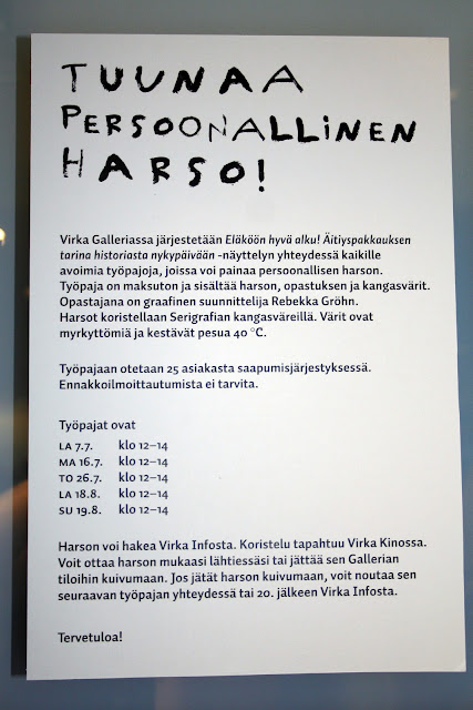 Näyttelyn yhteydessä esitetään myös erilaisia viedoita. Itse kävin katsomassa yhtä, sanotaan nyt 50 luvulla kuvattua, neuvolan synnytysvalmennuksesta kuvattua opetusvideota. Siinä kätilö näytti nuken avulla oikein tarkasti miten ja missä järjestyksessä ja otteilla vauva kylvetetään, pestään ja kiedotaan pyyhkeeseen. Kaikki oli hyvin tarkkaa ja nuoret äidit kuuntelivat vakavina. Lisäksi näyttelyn ohessa järjestetään harsojen tuunaus työpajoja.