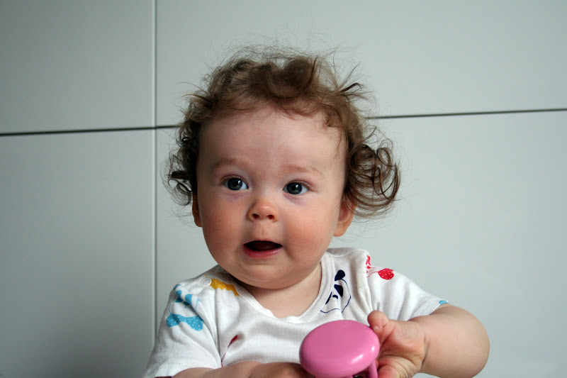 Samoin kuin kuukausi sitten, se seisoo ja kävelee tukea vasten. Kontaamisen lisäksi eteepäin pääsee hyvin polvillaan kävellen. Jos käsissä on jotain eritysien milelenkiintoista (kuten äidin puhelin) voi E vahingossa seistä hetken kokonaan ilman tulkea. Ruoka maistuu jo vähän paremmin, hampaita ei edelleenkän ole yhtään. Rastat olemme saaneet joksenkin kuriin.