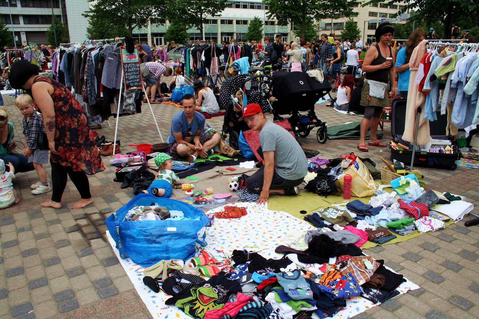 Puistokirppiksille olen usein osallistunut ostajan roolissa. Mutta tällä kertaa lähdimmekin Miiun ja molempien perheiden kanssa löyömään rahoiksi. Olimme paikalla hetkeä enne tapahtuman alkua, mutta puistossa olikin jo täysi kirrpistohina päällä, eikä meille meinannut löytyä kunnollista kirpparipaikkaa. Lopulta oli pakko jäädä puiston laitaan, vähemmän vehreimmille nurkille, kuten hätäisesti otetuista kuvista huomaa. Sijainnin merkityken kyllä huomasi, etenkin kuin viimeiseksi myymään tulijat eivät voineet muuta kuin ryhmittyä myyntipaikamme ympärille.