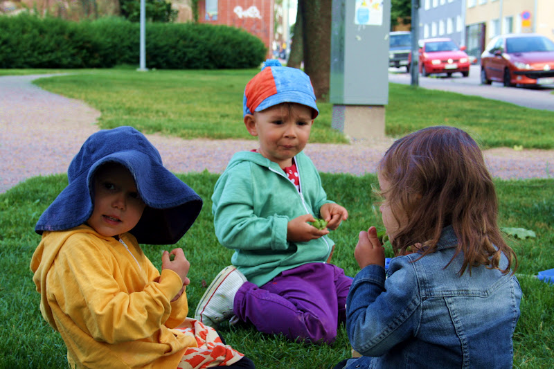 Tällainen kaupunkiasuminen sopii meille tosi hyvin. En usko että olisin kovinkaan onnellinen ulkoillessani joka päivä lasten kanssa omalla pihallamme ilman kummempia aikuiskontakteja. Mutta kieltämättä oma piha olisi ihana. Kuinka paljon se helpottaisikaan uloslähtöjä talvella. Puetun lapsen voisi lähettää omalle pihalle leikkimään ja odottamaan. En hirveästi odota tulevaa talvea, pukemisrumbaa, kuumassa eteisessä kiukuttelua ja hikoilua. On meillä toki oma kiva piha hiekkalaatikoineen ja leluineen, mutta se ei ole kokonaan aidattu enkä muutenkaan voisi Kaapo sinne yksin jättää tai lähettää.