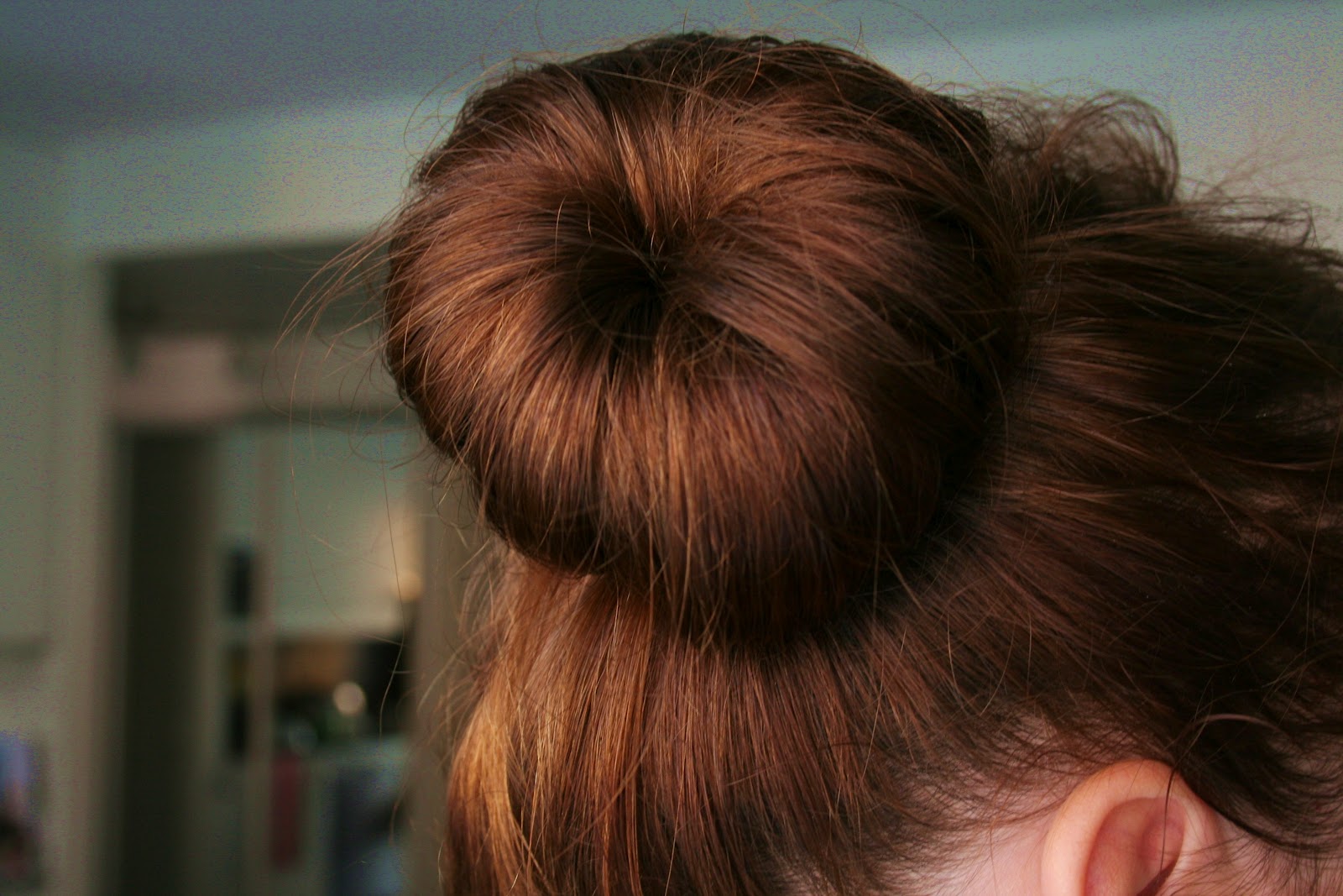 Nutturan kokoon vaikuttaa tietysti myös omien hiusten pituuden lisäksi sukan koko. Kuvassa minulla on rinkeliksi rullattu ihan tavallinen nilkkasukka, mutta tässähän voi käyttää polvisukkaa, sukkahousun tai legginssinkin lahjetta.