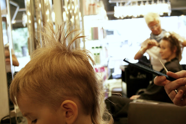 Ja voi kun meidänki poika kasvaa, niin vien sen kampaajalle. Vaihtoehtoina kun on joko mummun saksi-leikkaus tai isi vetää koneella siilin 😀