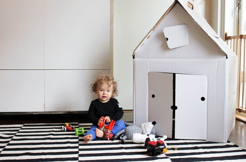 Lasse rakensi viime talvena isosta pahvilaatikosta ihastuttavan pahvitalon. Olin itsekkin ihan yllättynyt kuinka pienellä vaivalla voikaan saada niin kivannäköisen mökin aikaan. Täällä ainakin näkyy vilaus siitä. Kaapo tykkäsi leikkiä pahvitalossa kovasti. Ajateltiin että joissain vaiheessa olisisimme maalanneet tai koristelleet sen jotenkin. No, lapsella oli samat aikeet. K kävi maalamassa mökkiä tuubilisella sinkkivoidetta ja se oli pakko heittää pois.