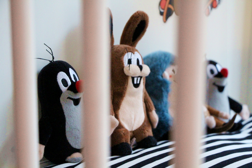 Sitten tärppäsi. Muutaman kilometrin päästä kotoamme löytyi pienikokoinen Muuramen valkoinen pinnasänky. Muutoin se oli aivan tavallinen, mutta edellinen omistaja oli liimannut siihen myyrätarroja. En ollut aluksi ihan varma tarroista, mutta muutaman päivän mietinnän jälkeen olin jo aivan ihastunut sänkyyn tarroineen ja ostin sen meille.