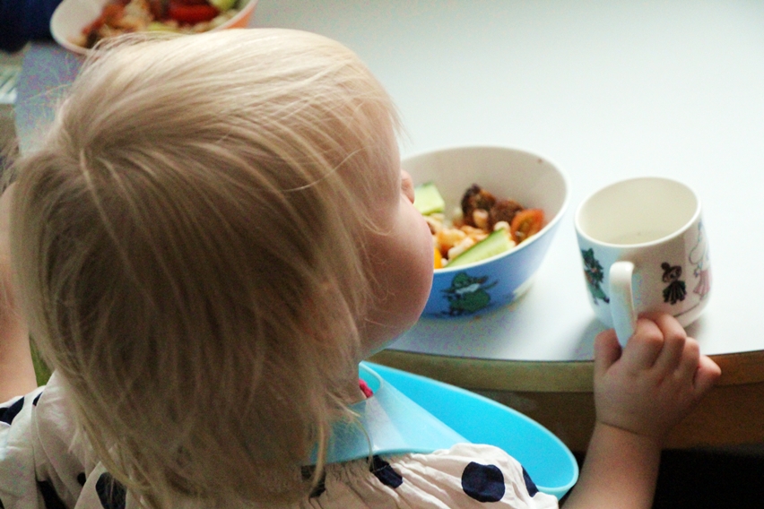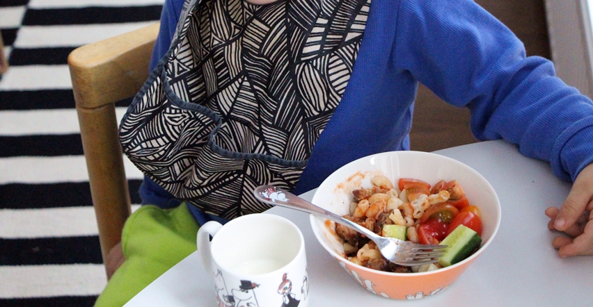 Sillä ei ole kuin kuusi hammasta, mutta jotenkin se ne varmaan pureksii 😀 ! Makaroonit menee ihan sellasenaan, lihapullat pilkon. Aika karkeeta ruokaa syö, mutta lapsilla vaihteelee tosi paljon milloin suun hermot kehittyvät ja kakominen loppuu. Ekan kanssa meni tosi pitkään ennen kuin söi muuta kuin ihan sileää sosetta oksentamatta/tukehtumatta.