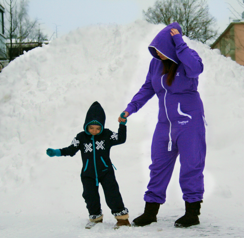 Meidän haalarit ovat tosi mukavat ja pehmoiset. Materiaali näissä on näissä sellaista aika normaalin paksuista collegekangasta (puuvillaa). Haalari on ihana vetää päälle olo-asuksi, saunan jälkeen tai viluisena vaikka yöpuvuksi. Meidän haalarimme eivät siis oikeasti sovellu lumessa leikkimiseen, mutta OnePieceltä löytyy siihenkin sopiva, superlämpöinen teddyfleece haalari. Sellainen voisi olla tosi hauska vaikka pulkkamäessä.