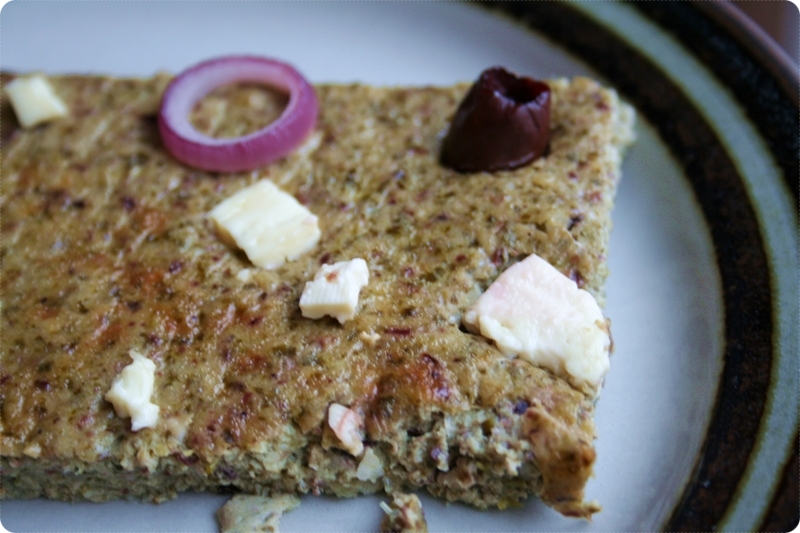 Säästä muutama nokare fetaa, sipulia ja oliiveja piirakan päälle myöhemmin laitettavaksi. Surauta kaikki ainekset tehosekoittimessa tai blenderissä pieneksi ja kaada leivinpaperilla vuoratulle pellille. Voit myös tehdä taikinan puolikkaana piirakkapohjaan.