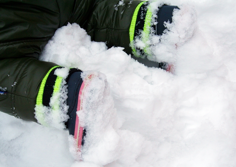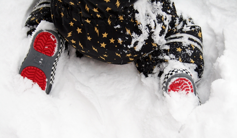 Ihana kun toinen siella naamaan myoten lumessa. Ei oo Crocseja, mutta paljon samantyyliset kengat ja tuo ”kumisaapas” osa on kylla hyva kun pysyy varpaat kuivina.
