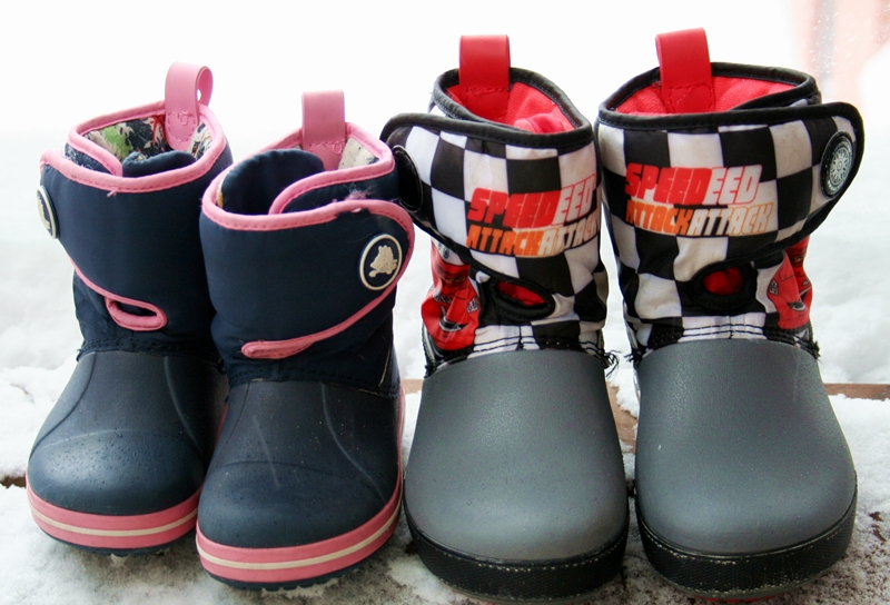 Elvis on käyttänyt nyt reilun kuukauden verran Kaapon muutaman vuoden takaisia kenkiä. Ja Kaapo taas sai hiljattain valita Crocsilta uudet, edellisten kärjistä kuluneiden talvikenkien tilalle. Koska etenkin noista ekoista kengistä on jo vähän enemmän käyttökokemusta, voin sanoa että ovat hyvät. Pienet varpaat ovat pysyneet lämpiminä ja varret ovat pitäneet jalat suurimmaksi osaksi kuivina myös hyvin loskaisilla keleillä. Kenkiä on testattu myös ääriolosuhteissa, ja sen verran voin sanoa että polven syvyisiä lätäköitä ne eivät kyllä ihan täysin kestä. Muuten hyvin. Omalta kannata suuri plussa on myös äärimmäisen simppeli malli, joka on helppo sujauttaa jalkaan ja sulkea tukevalla tarralla.