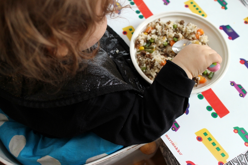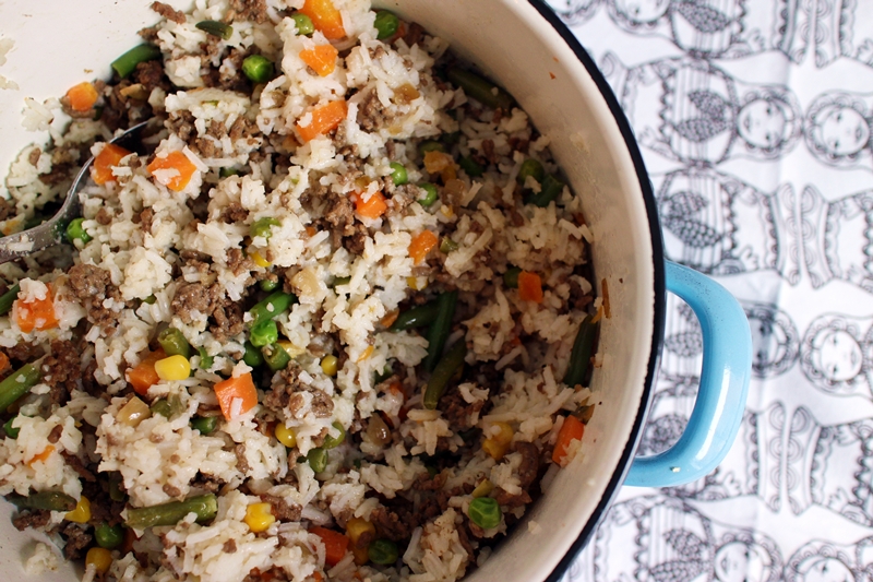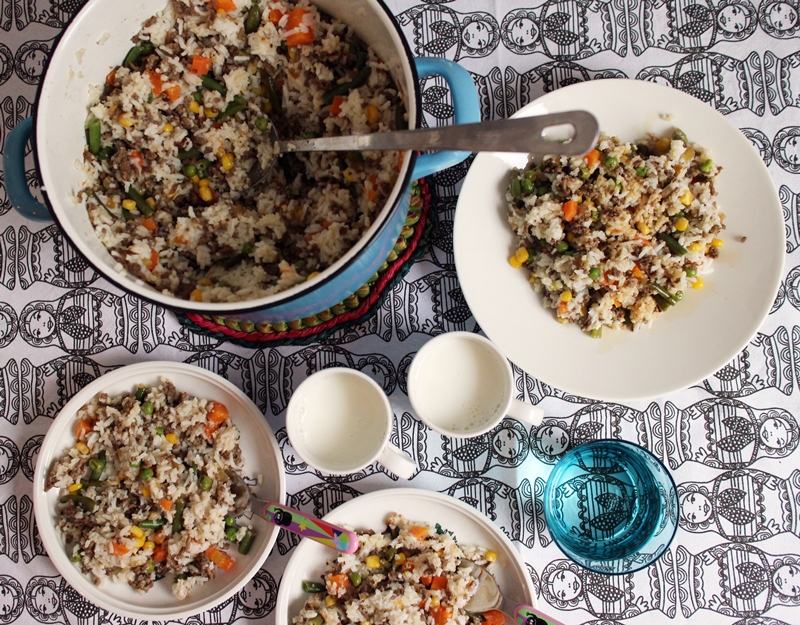 Tämä kuuluu meidänkin arkiruokien joukkoon! 🙂 Teen sen kyllä vähän erilailla, joka tekee siitä vielä helpomman: Paistan ensin jauhelihan ja sipulin, lisään niiden joukkoon vettä, lisään riisin ja porkkanan joukkoon myös ja ne kypsyy siinä. Sitten vaan pakastevihannekset mukaan. Jää vain yksi kattila tiskattavaksi! 🙂