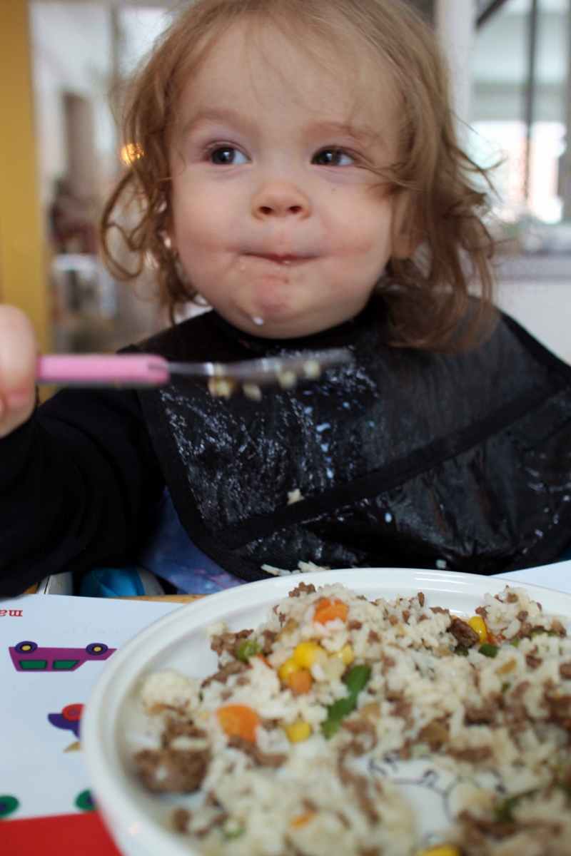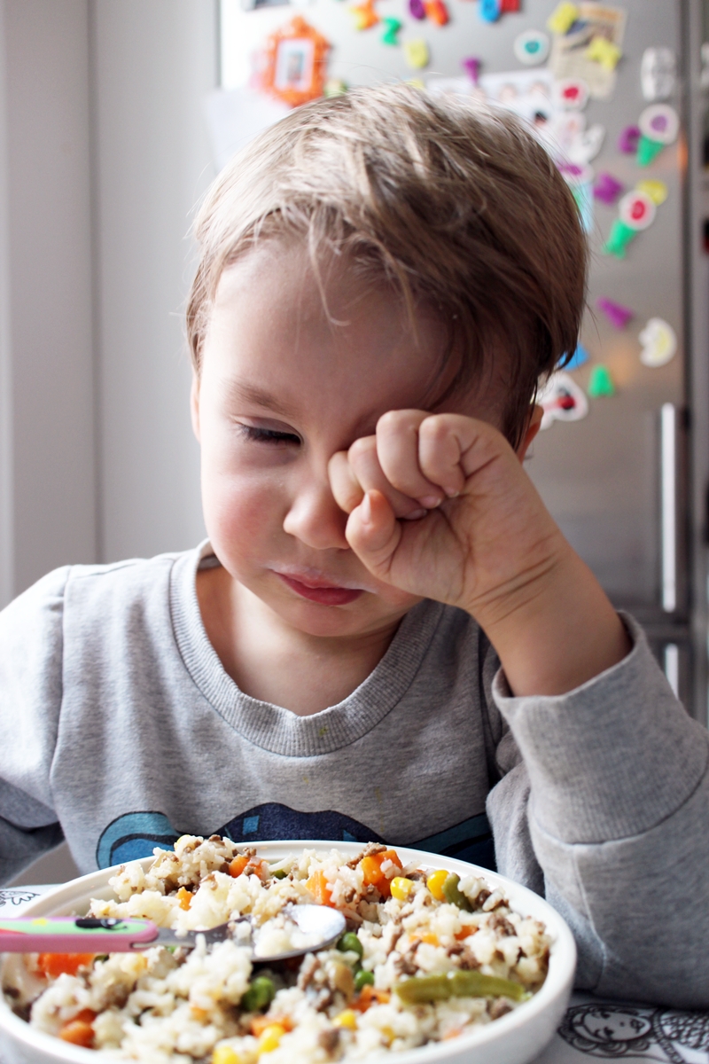 Käytin tällä kertaa basmati-riisiä, joka sopii tuohon mielestäni hyvin. Risiistä tuli todella ylikypsää, kun piti hakea Kaapo kerhosta kesken ruoanlaiton. Makuun se ei vaikuttanut mietenkään, itseasiassa se olikin aika hyvä juttu. Kun riisi pysyi hyvin kasassa, ei sotkutkaan ollut niin suuri mitä usein riisiruokien kanssa on!