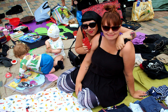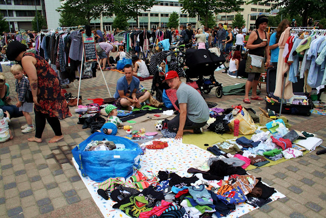 Puistokirppiksille olen usein osallistunut ostajan roolissa. Mutta tällä kertaa lähdimmekin Miiun ja molempien perheiden kanssa löyömään rahoiksi. Olimme paikalla hetkeä enne tapahtuman alkua, mutta puistossa olikin jo täysi kirrpistohina päällä, eikä meille meinannut löytyä kunnollista kirpparipaikkaa. Lopulta oli pakko jäädä puiston laitaan, vähemmän vehreimmille nurkille, kuten hätäisesti otetuista kuvista huomaa. Sijainnin merkityken kyllä huomasi, etenkin kuin viimeiseksi myymään tulijat eivät voineet muuta kuin ryhmittyä myyntipaikamme ympärille.