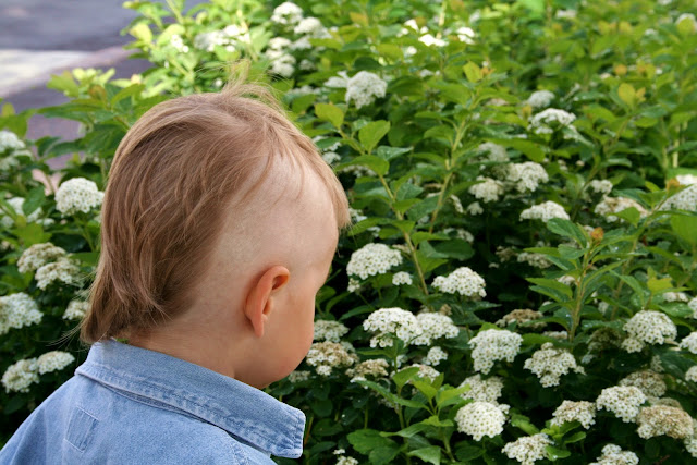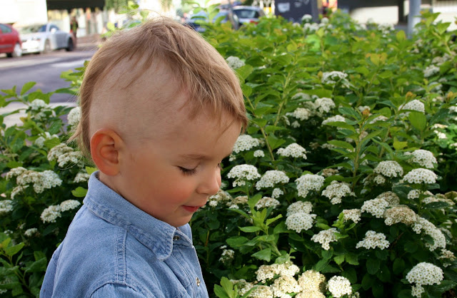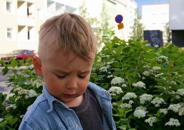 Kaapon hiuksia on muutaman kerran käyty leikaamassa äitini luona kampa sekä itse olen niitä myös napsinut aina silloin tällöin. Viime talvesta saakka niiden on kuitenkin annettu kasvaa. Yhtenä hiusinspiraationa oli tämä Mini Rodinilta tuttu suloisen rento pitkätukkainen poika. Pienillä pojilla näkee harvoin kivoja hiuksia. Ne ovat pääsosin aina otsatukka, potta tai siili. Kaapolla oli usein se otsis.